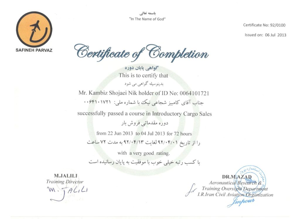 Introductory cargo sales course certificate