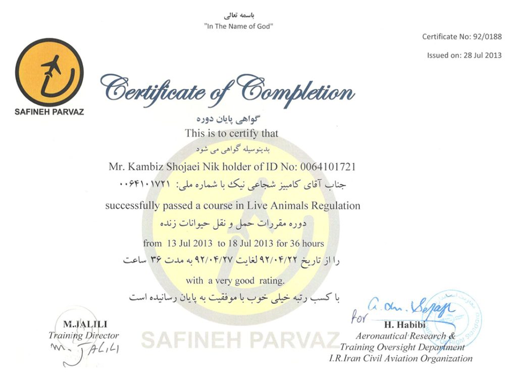 Live animals regulation course certificate