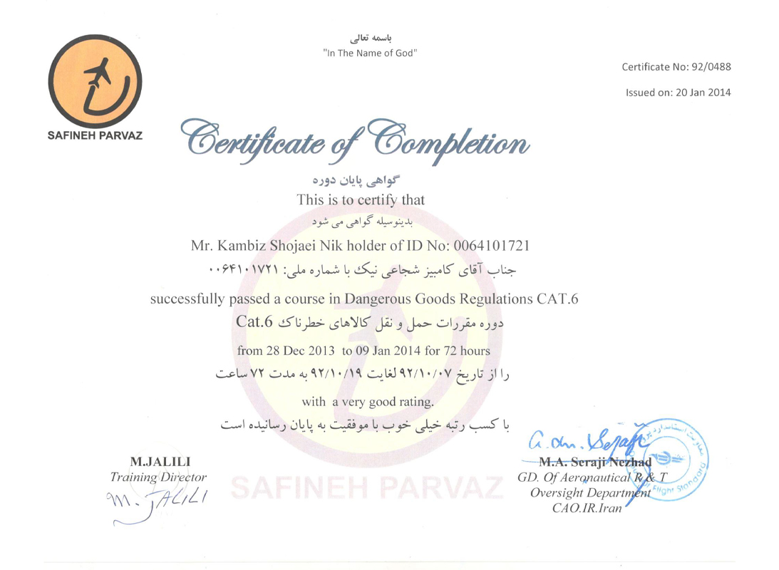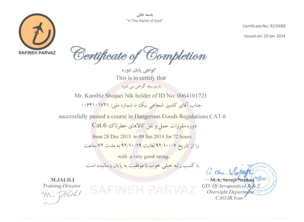 Dangerous goods regulations CAT.6 course certificate